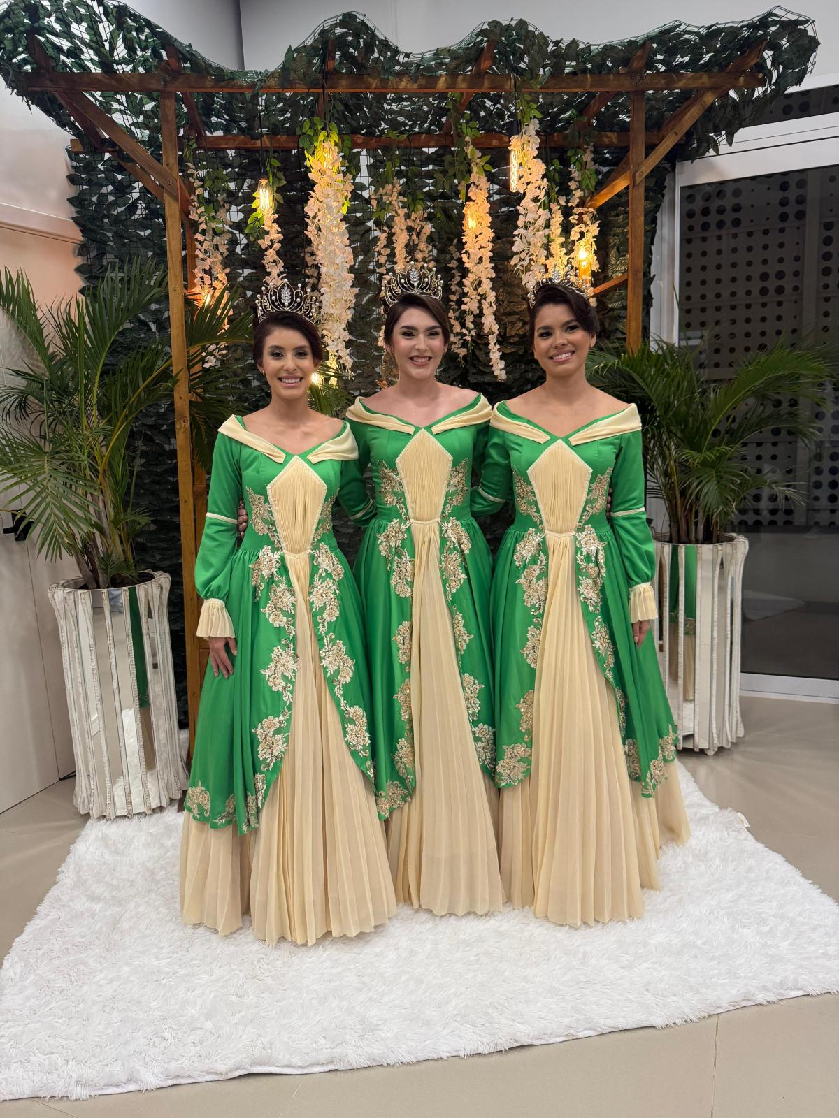 Já os vestidos oficiais foram idealizados por Yuri Krause e ganharam vida pelas mãos da costureira Vera Rosana Deckmann Finkler, resultando em peças únicas que unem elegância e significado histórico.
