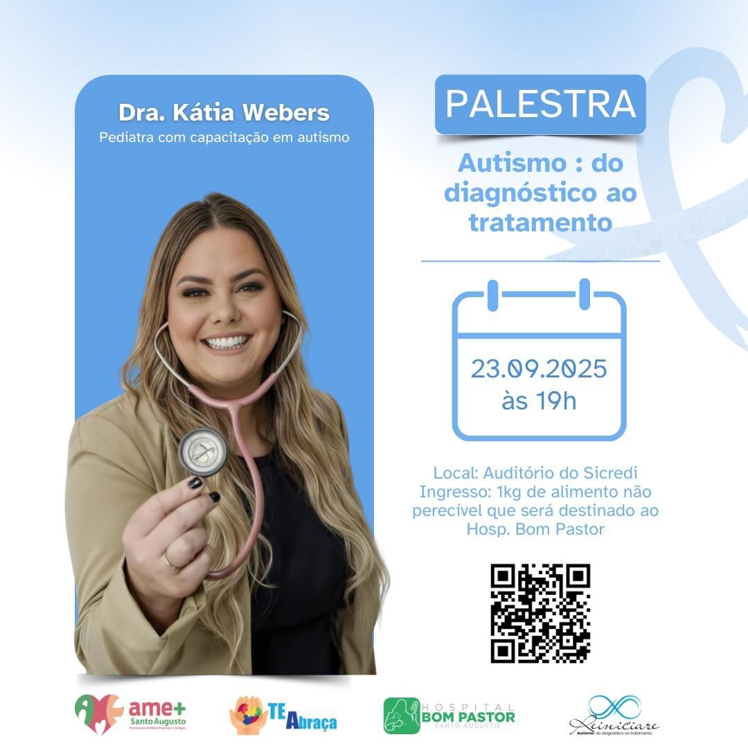 Santo Augusto será palco de um evento importante para famílias, educadores e profissionais da saúde interessados no Transtorno do Espectro Autista (TEA). A Dra. Kátia Webers, pediatra com capacitação em autismo, ministrará uma palestra sobre o tema "Autismo: do diagnóstico ao tratamento".