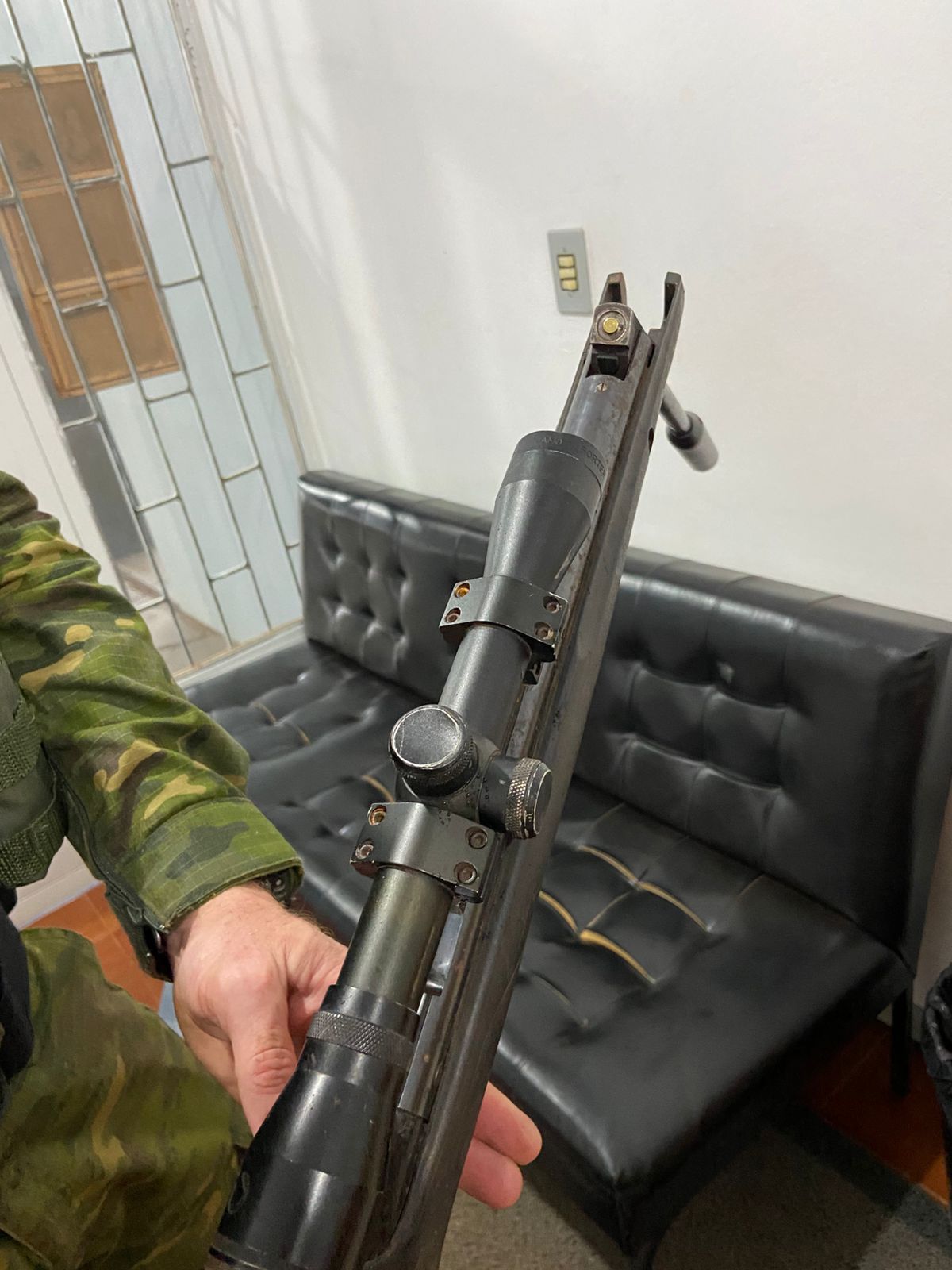 No estabelecimento comercial, foram encontrados animais silvestres mantidos em cativeiro sem autorização — um macaco e um papagaio — configurando crime ambiental. Já na residência do interior, os policiais localizaram caixas de cigarros contrabandeados, totalizando 2.400 maços de origem paraguaia, além de uma arma de fogo (uma espingarda de pressão modificada para calibre .22) e munições.
