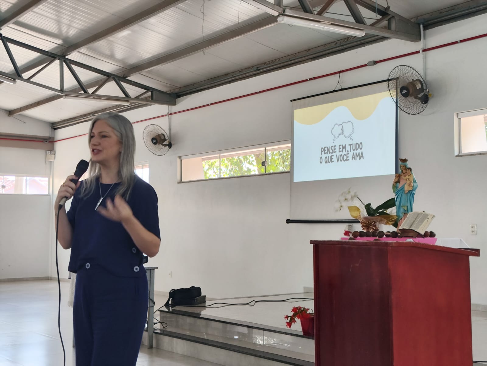 A tarde seguiu com a palestra “Viver é bom!”, ministrada pela publicitária Grazi Sperotto, que destacou a importância de cultivar o entusiasmo, a gratidão e o cuidado com a saúde física e emocional.