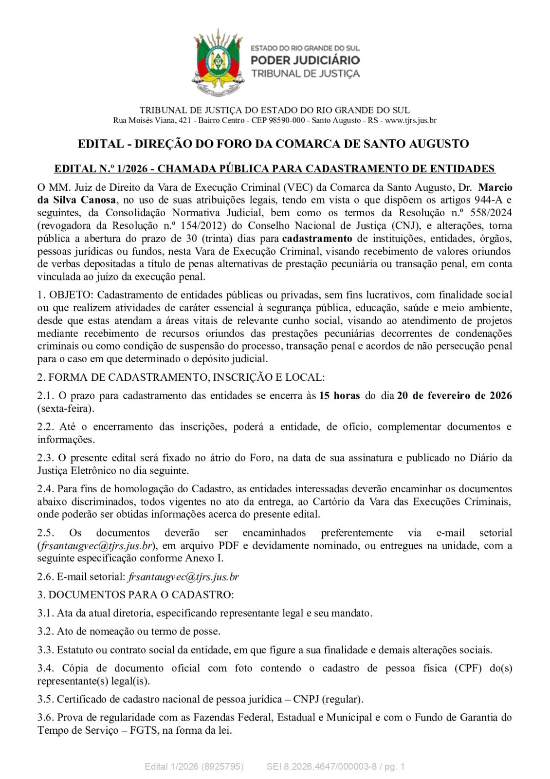 A Direção do Foro da Comarca de Santo Augusto publicou o Edital nº 1/2026, que abre chamada pública para o cadastramento de entidades interessadas em receber recursos oriundos de penas alternativas de prestação pecuniária e transações penais. Trata-se de valores pagos pelas pessoas, condenadas em crimes ou fruto de acordo (para se evitar processo).