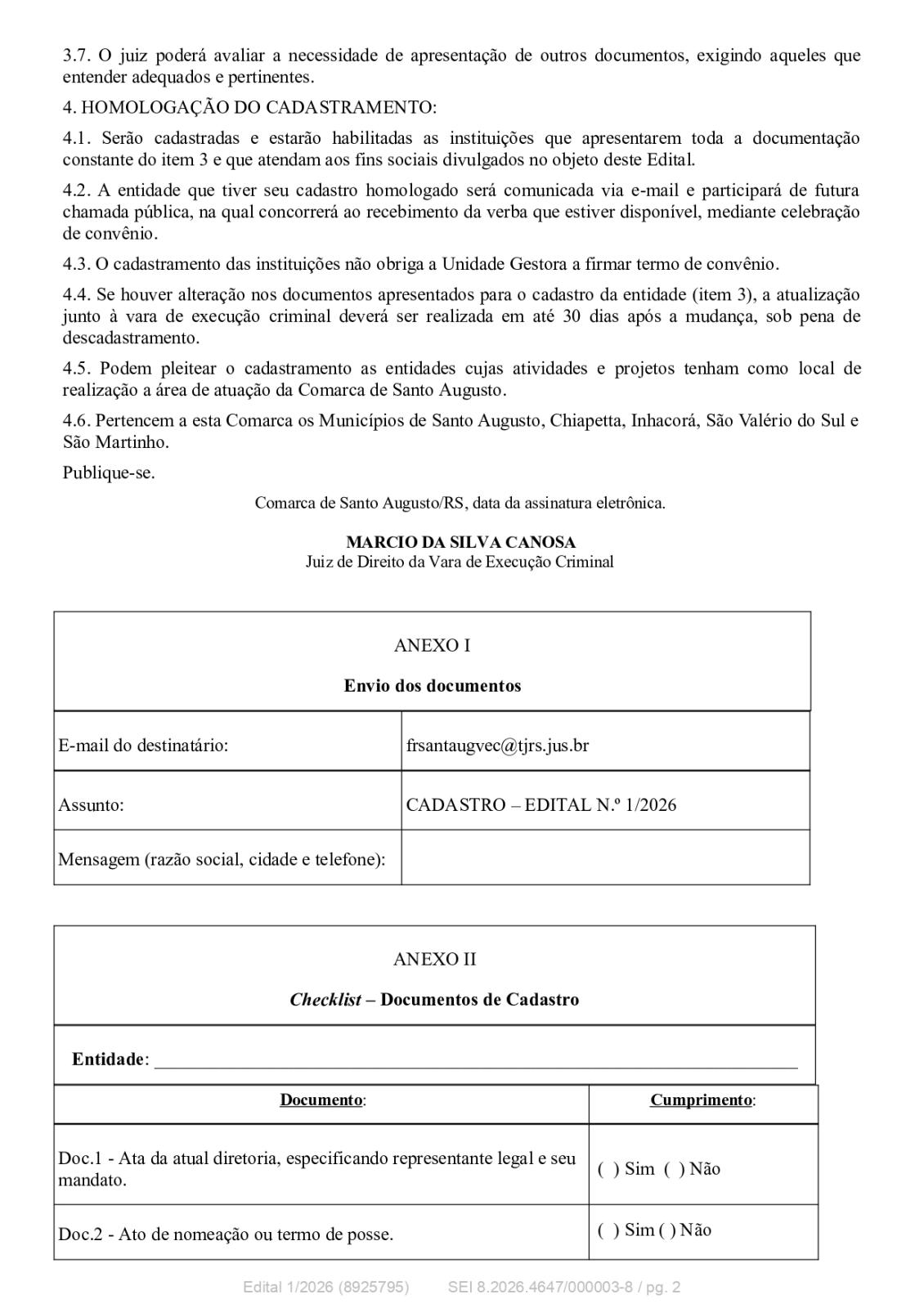 Mais informações podem ser obtidas diretamente na Vara de Execução Criminal da Comarca de Santo Augusto.