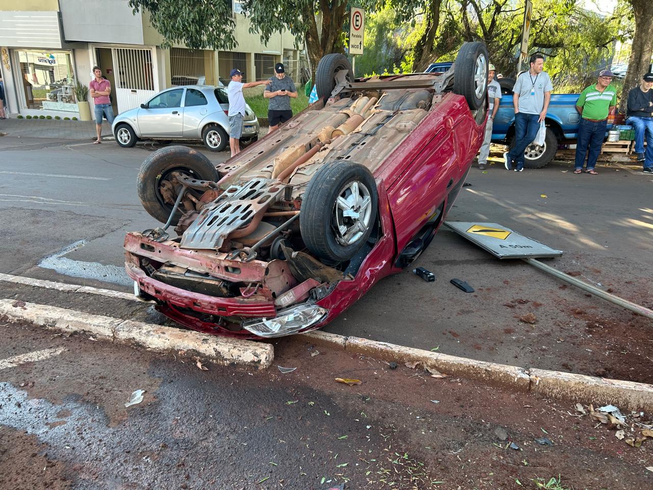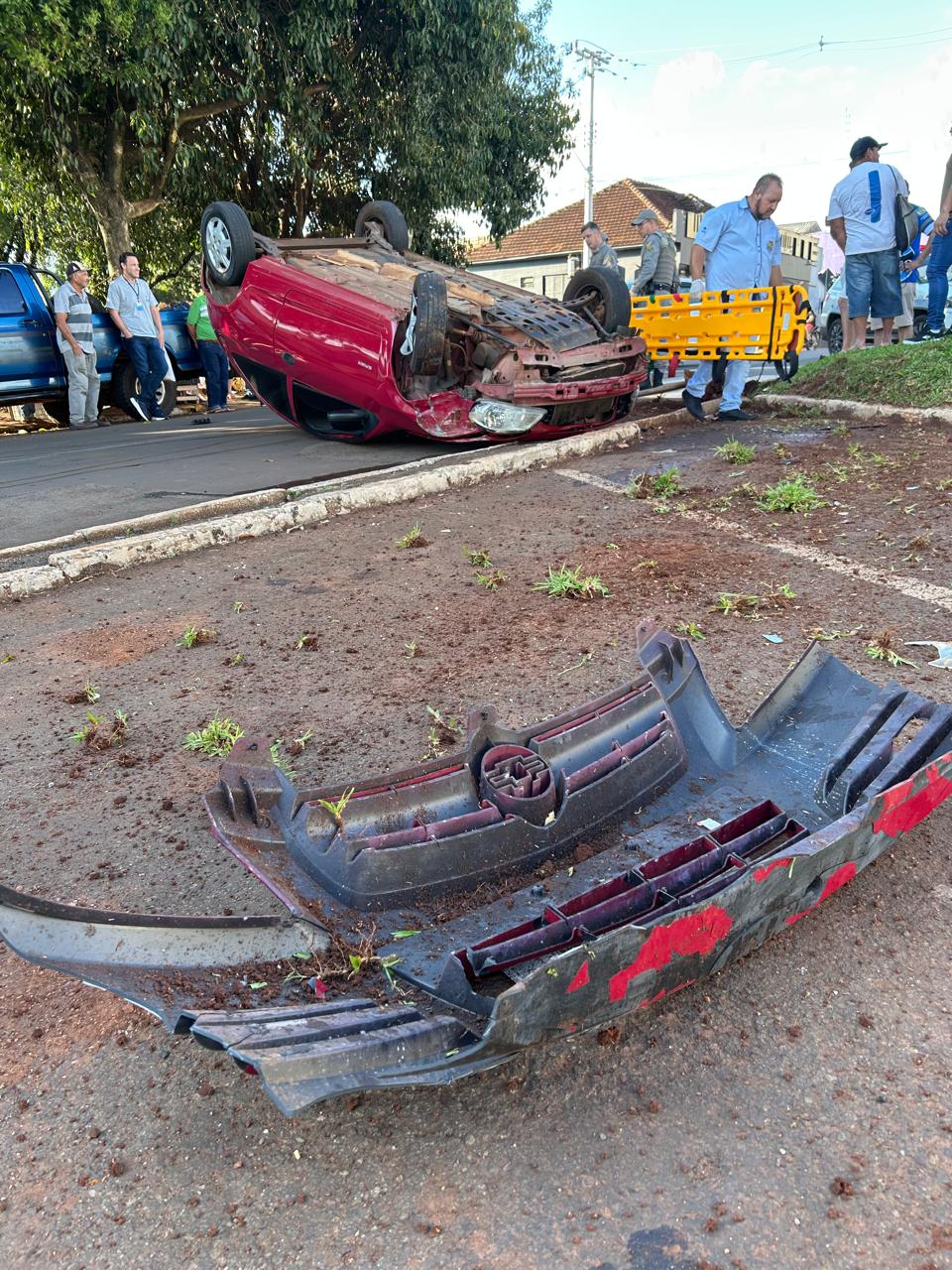 Com o impacto, o Celta acabou capotando, resultando em danos materiais nos dois automóveis.